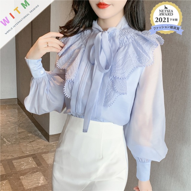 パフスリーブ シフォンブラウス リボン付き フレア レディース 透け感 スタイリッシュ