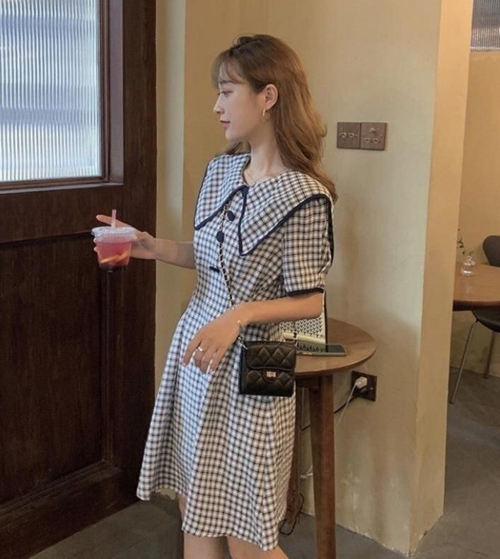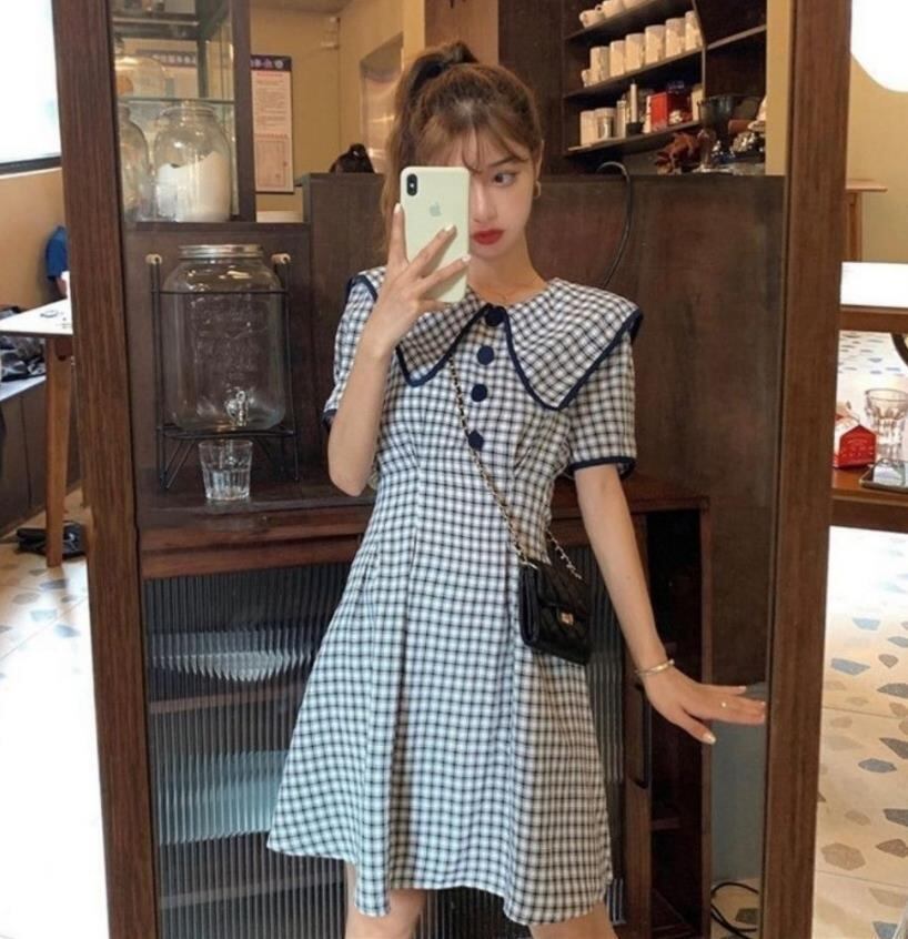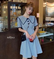 春夏 女 レディース ハイウエスト 半袖 チェック柄 ミニ ワンピース ドレス 台型スカート