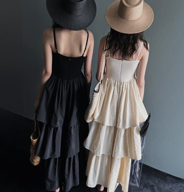 2025年夏新作 ワンピース ロング丈ワンピース キャミワンピ 異素材 サスペンダー Sweet 可愛い