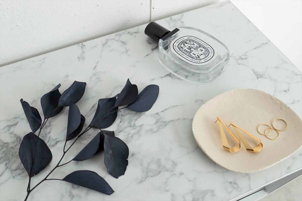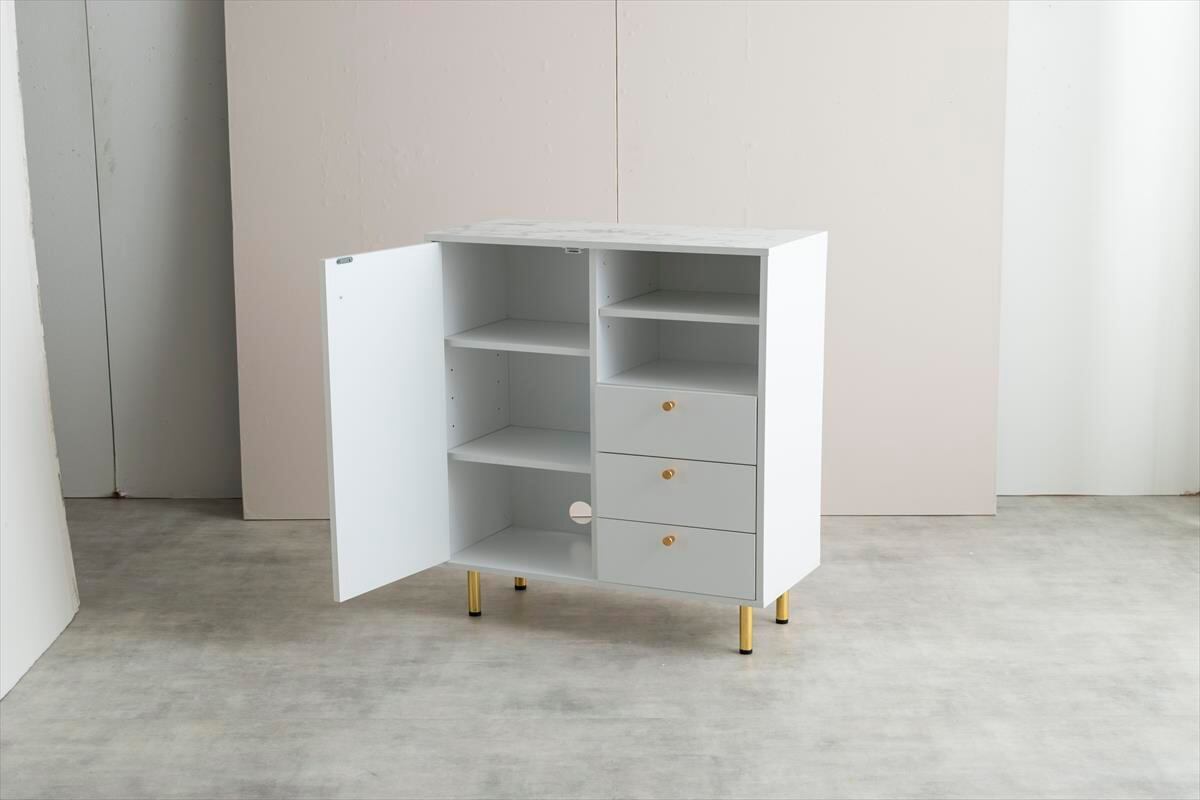 天板の大理石柄とゴールドのあしらいが特徴の『Camila(カミラ)』シリーズのキャビネット