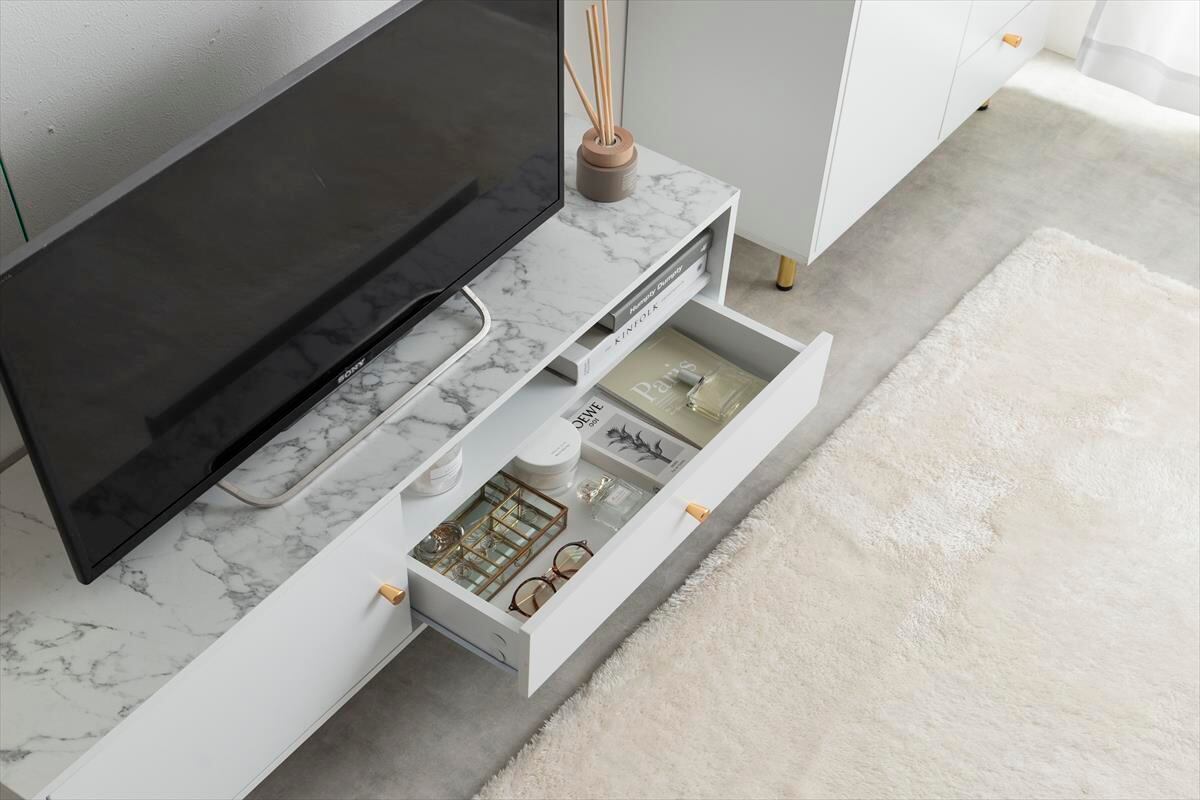 天板の大理石柄とゴールドのあしらいが特徴の『Camila(カミラ)』シリーズの引き出し付きテレビボード