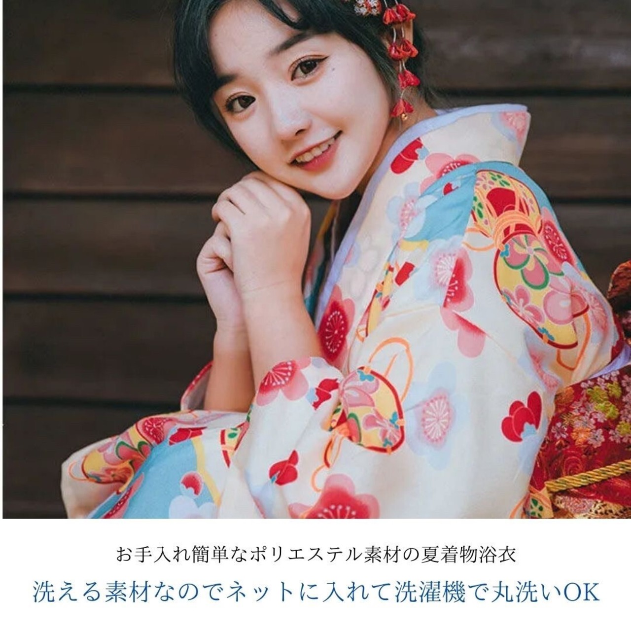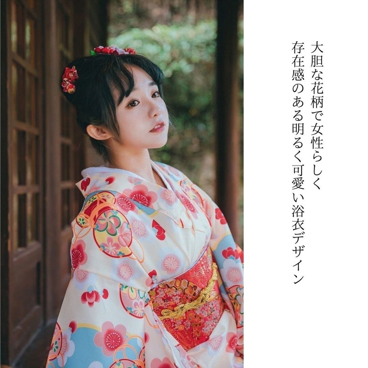 大胆な花柄で女性らしく、存在感のある明るく可愛い浴衣デザインです。長襦袢や足袋を合わせて夏の街着として、または浴衣スリップを着用の上で浴衣としてもお召し頂けます。腰紐付きですぐに綺麗な着姿に。