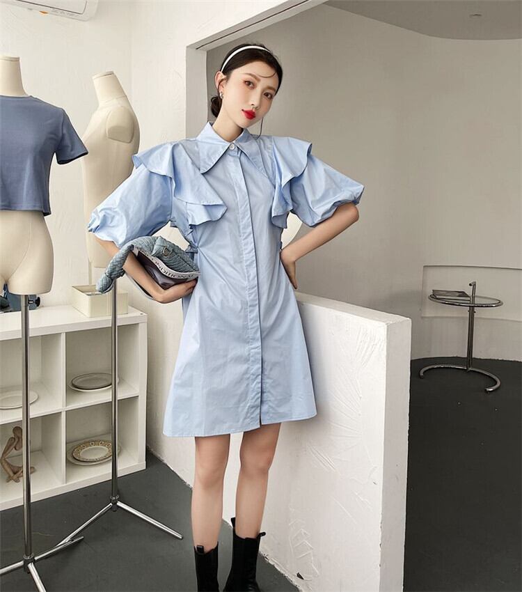 シャツワンピ カラーマッチング デザインセンス パフスリーブ ベスト 2点セット
