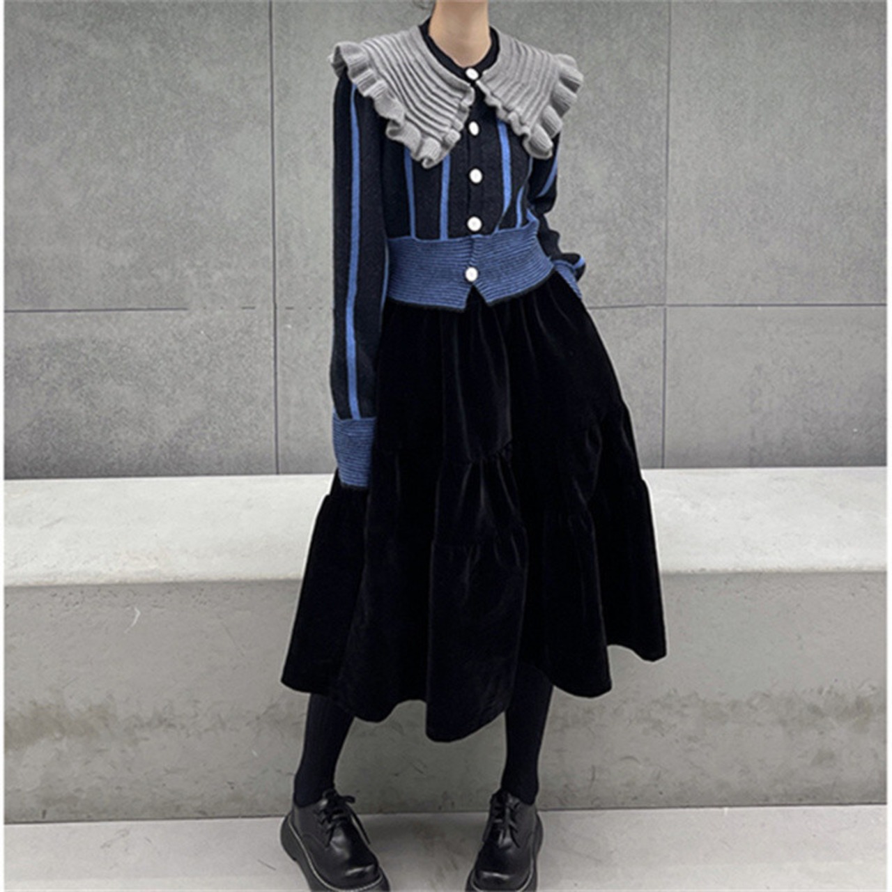 ストライプ 長袖 セーター ベルベット スカート ファッション レトロ 減齢 人形の襟