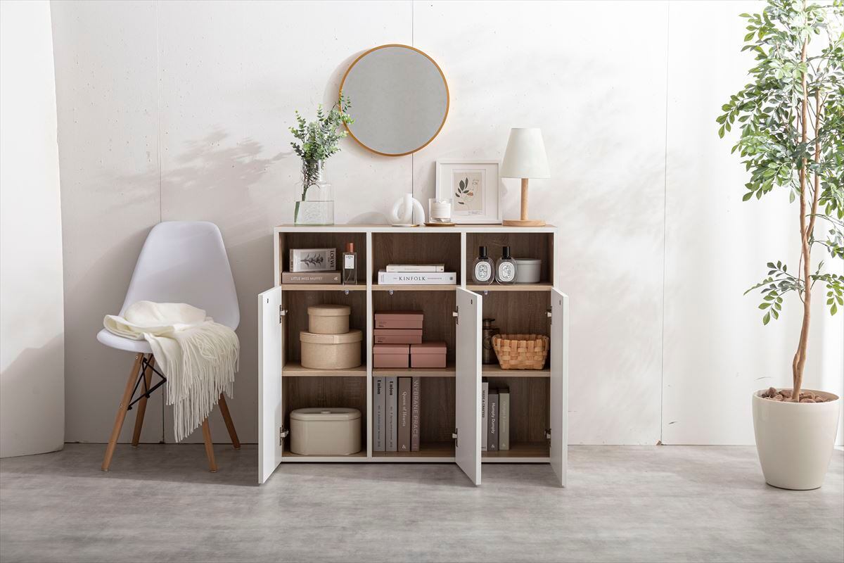 充実した収納力を誇り、内部には可動棚を備えています。収納物に応じて棚の高さを調整できるため、効率的なスペース利用が可能です。お部屋をいつでもすっきりと保つ強力なサポーターです。